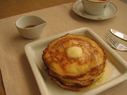 ホットケーキの要領で焼いて、有塩バターとメープルシロップ。