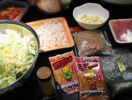 具はね、トマト缶、にんにく、ベーコン、新玉ねぎ、菜の花、ツナ!