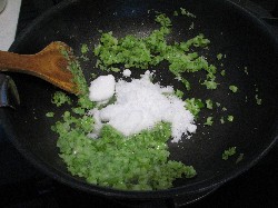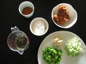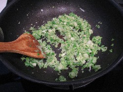 1、 半量のごま油で、ネギ、唐辛子、生姜を炒めます。