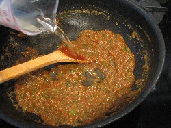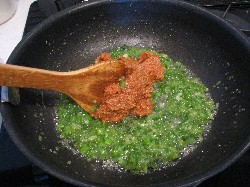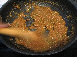 3、 こんな風につやつやしてきたら味噌を加えます。