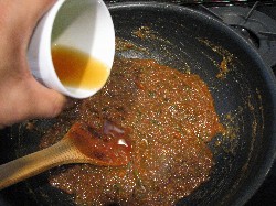 6、みりんを加え、さらにかき混ぜつつ2分弱。