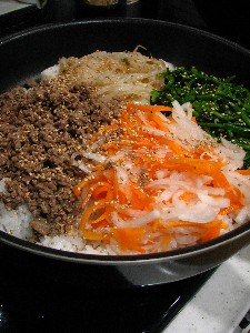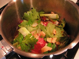 にんにくを炒め、→玉ねぎを炒め、→ 牛肉を炒め、→ スパイスを入れ、→