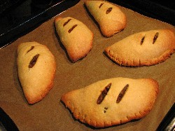 2、 生地の真ん中に5等分した具を載せて半分に折り、端をぎゅっとつまんで、好みで端や上に、切り込みを入れる。(画像参照)