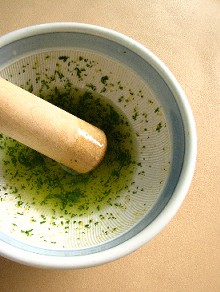 ミントの葉をあたり鉢で軽くつぶして、材料をどんどん混ぜていくだけ。
