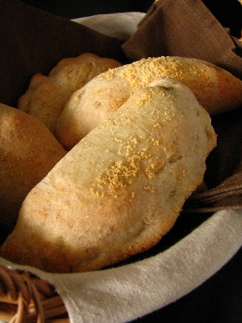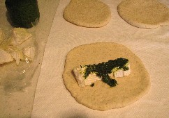 1、 1個約50g強で5分割して丸め、ラップではさんで直径12cm位に麺棒で伸ばす。