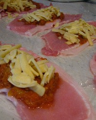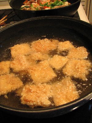 豚の薄切り肉で、ちょっと残ってた土曜日のドライカレーととろけるチーズをはさんで、ダイレクトに両面パン粉。