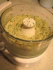 食パン、パセリ、にんにくを粉砕して、パン粉を作成。