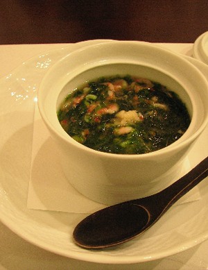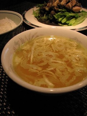 お肉を蒸した時のおいしい出汁をのばして、スープを作りました。