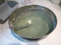 1、 ボールに上新粉、浮き粉、砂糖、乾燥ヨモギを入れてぐるぐるっと均一にして、水360ccを少しづつ混ぜていきます。