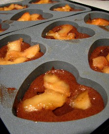 4、型に流し込み、等分にチョコを入れ、りんごをのせる。