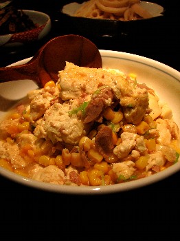 豆腐、コーン、ツナ缶、ネギで、炒り豆腐よ。