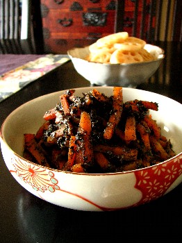 出汁で柔らかく煮た人参を胡麻よごしに。
