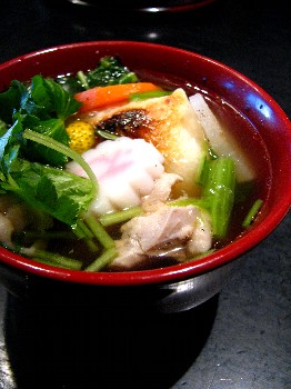 焼いた四角いお餅、大根、人参、鶏肉、なると、三つ葉、柚子。