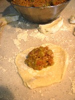 2、 切った断面を上にして、麺棒で丸く伸ばす。