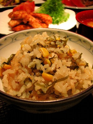 切り昆布とコーンの炊き込みご飯です。