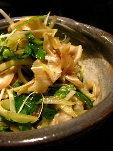 それを熱湯でサッと茹でて、ざるに揚げます。