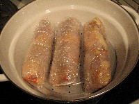 タコ糸で縛って、ラップして、蒸してます。