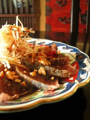 ② カツオを盛り付けて、白髪ねぎ、ピーナツを散らし