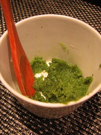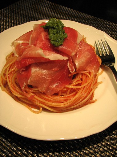 ベランダのバジル、にんにく、パルメザンチーズ、オリーブ油、乾煎りアーモンドパウダーをフープロにかけて作ったバジルペースト添え。