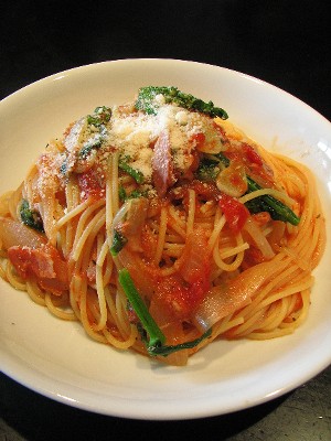 具はね、トマト缶、にんにく、ベーコン、新玉ねぎ、菜の花、ツナ!