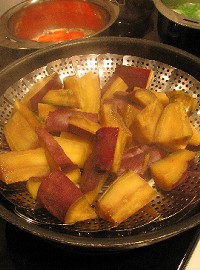 5、 ラップをして、湯気の立った蒸し器で中弱火で、約15分蒸します。