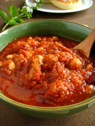 玉ねぎセロリを気長にのんびり甘くなるまで炒め、豚バラを炒め、お豆も加え、トマトジュースてコトコト。